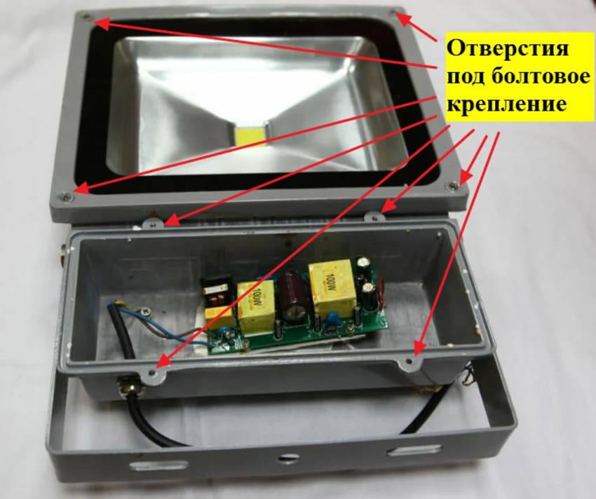 Если стекло или линза крепиться с помощью болтов или винтов, то нет проблем, как разобрать светодиодный прожектор. Располагаться они могут на передней панели или задней стенке изделия. При разборке их необходимо выкрутить и сохранить для последующей сборки.