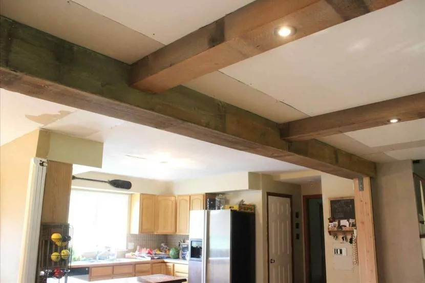 Работу по обустройству чернового потолка выполняют так, чтобы в дальнейшем применить решетчатый каркас и балки в качестве основы для установки отделочных гипсокартонных панелей.