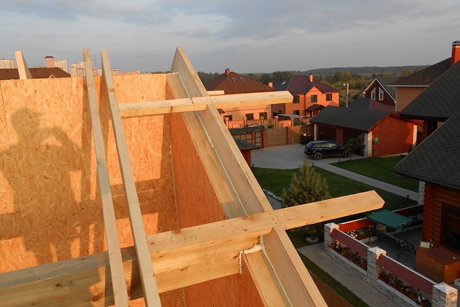 - В местах соединения скатов ставим доску на широкую сторону – точно по прямой, от угла крыши до угла дома;
