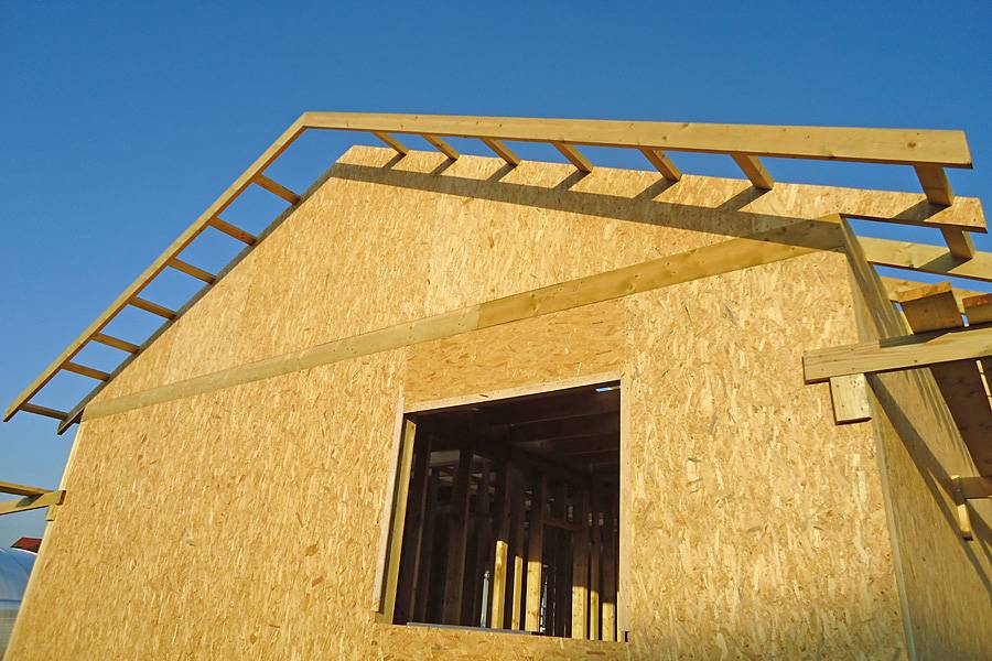 - Монтируем стропила – обрезаем, если есть выступы за фасад, проверяем параллельность и одинаковое расстояние от конца стропил до стен;