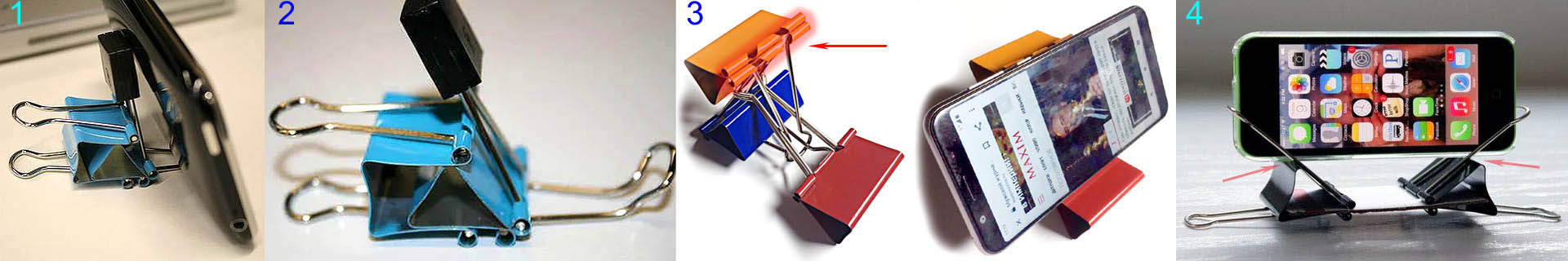 На верхнее ушко для полной гарантии сохранности аппарата натягивается ластик, надколотый перочинным ножом или маникюрными ножницами. Однако на самом деле такая подставка небезопасна: левый (на поз. 2) зажим может самопроизвольно провалиться вовнутрь правого или выскочить наружу, «выстрелив» телефоном. Композиция из 3-х зажимов вполне устойчива, но в ней есть потенциально «царапучее» место (помечено красным по показано стрелками на поз. 3). «Обезвредить» его просто – заклеить скотчем. Совершенно безопасна подставка из 2-х зажимов и полоски плотной бумаги или картона, поз. 4. Если углы зажимов еще и оклеить скотчем, где показано стрелками, то такую подставку можно считать условно пригодной для длительного пользования. Еще о телефонной подставке из зажимов для бумаги см. видео:
