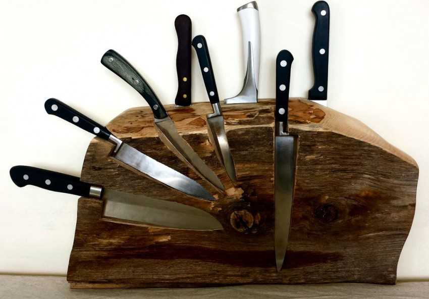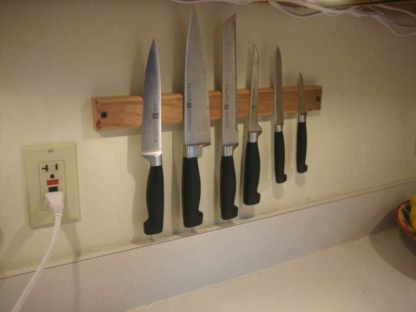 Для изготовления магнитной подставки для ножей понадобятся деревянная дощечка, горячий клей и 4-5 магнитов из неодима. В качестве инструментов используют стамеску и пистолет для клея. Дизайн подобного приспособления обычно не отличается оригинальностью. Однако можно поработать над цветом и фактурой, чтобы получить эксклюзивную вещь, которая будет идеально сочетаться с интерьером кухни.