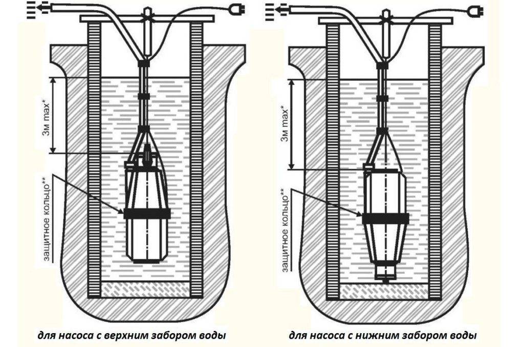 Электрический провод ложится на планку свободно без каких-либо натяжений. Теперь насос готов к работе. Перед использованием его нет необходимости смазывать или заливать водой. В случае, если устройство имеет 1 класс защиты, то розетка нуждается в заземлении. Включать прибор можно сразу после того, как его погрузили в колодец, скважину или водоем. В случае, если устройство имеет нижний забор воды, то расстояние от корпуса до дна должно составлять до одного метра. Насосы с верхним забором воды можно погружать ниже, но при этом его корпус не должен соприкасаться с дном. Это может привести к повреждению при работе.