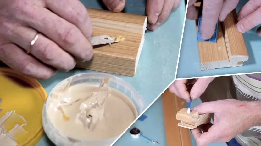 - Шпатлёвка. Она нужна для того, чтобы выровнять поверхность, убрать сколы и трещины. Специальной шпаклёвкой для древесины (на водной основе) заполняют неровности. Затем место нанесения аккуратно зашлифовывается мелкозернистой наждачкой.