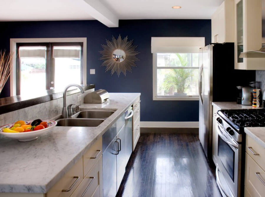 Не так давно появилась третья тенденция — покраска стен в кухне в два цвета. Выбираются цвета-компаньоны. Это могут быть оттенки одного цвета — темный и светлый, могут — контрастные или сочетаемые. Если хотите подобрать разные цвета, воспользуйтесь дизайнерскими таблицами сочетаемости цветов.