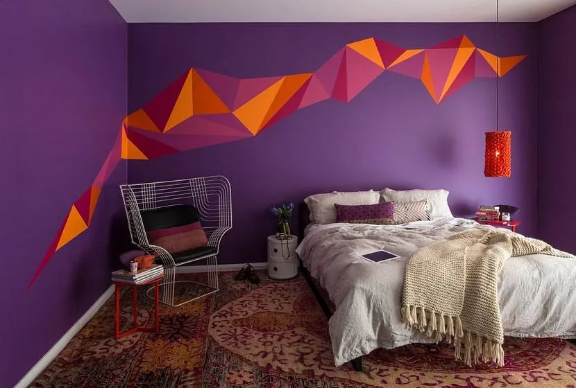 Отличная композиция, которую можно увидеть на стене спальни. Такое оформление подходит для винтажного и современного интерьера. Темно-фиолетовая основа отлично сочетается с оранжевым, лиловым и бордовым оттенками в геометрическом орнаменте. Размещение рисунка на две стены делает комнату визуально шире. Правильное окрашивание и четкие линии создают 3D эффект. Мотивы отделочного оформления повторяются и в остальных чертах интерьера.