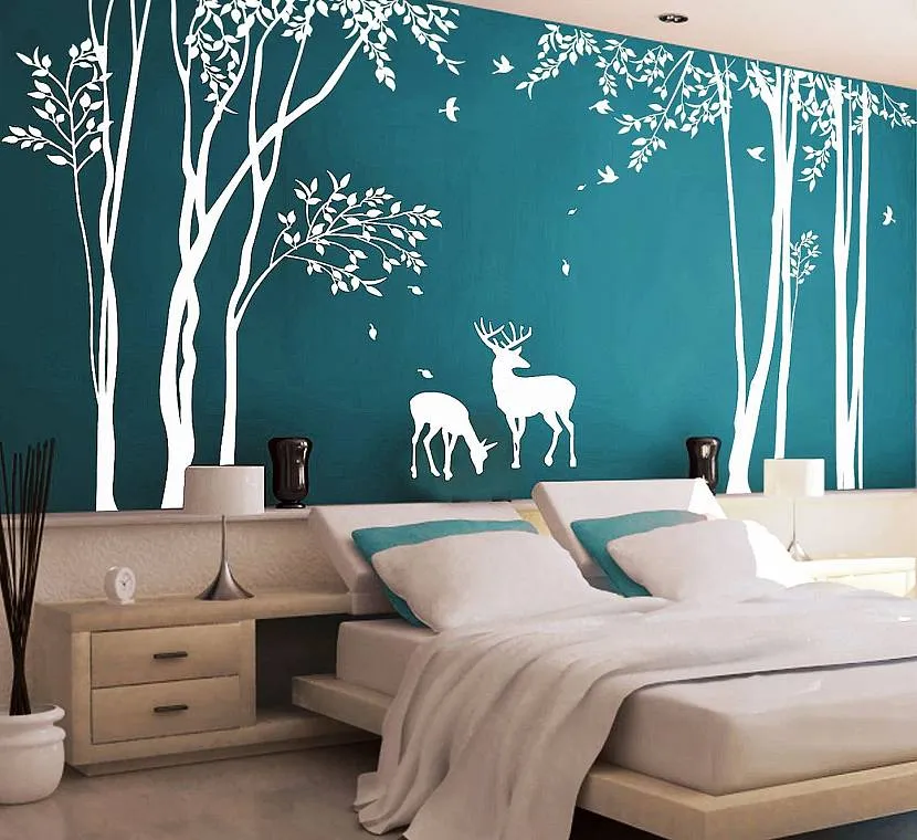 Такой рисунок будет интересен в детской комнате или спальне. Можно окрасить основную часть поверхности темным оттенком, например, бирюзовым, а дерево выполнить в белом цвете. Если есть художественные навыки можно нарисовать самостоятельно. В противном случае придется ограничиться готовым шаблоном.