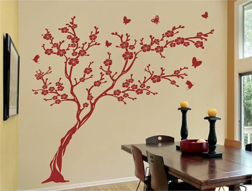 Можно использовать такое оформление для светлой гостиной или столовой. На бежевой стене создается рисунок сакуры красным. Также доступны для реализации и другие деревья, просто ветви от угла, зимние кустарники, осенние клены.