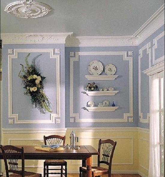 Совет: если галтели имеют красивый рельеф, то их детали можно подчеркнуть бронзовой краской, имитирующей позолоту. Однако в данном случае аналогичные золотистые элементы декора должны присутствовать в интерьере комнаты.