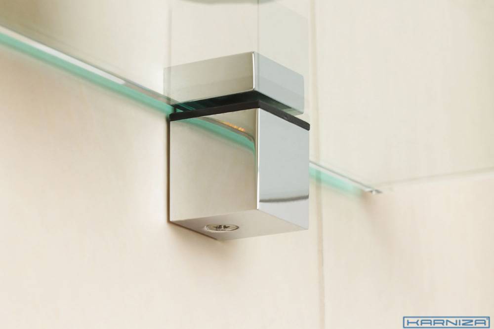Для стеклянных навесных полок крепежи устанавливаются тем же способом. Их крепят кронштейнами, являющимися разновидностью накладных крепежей. Их используют для полок из стекла. Внутри они имеют резиновую прокладку, которая защищает стекло.