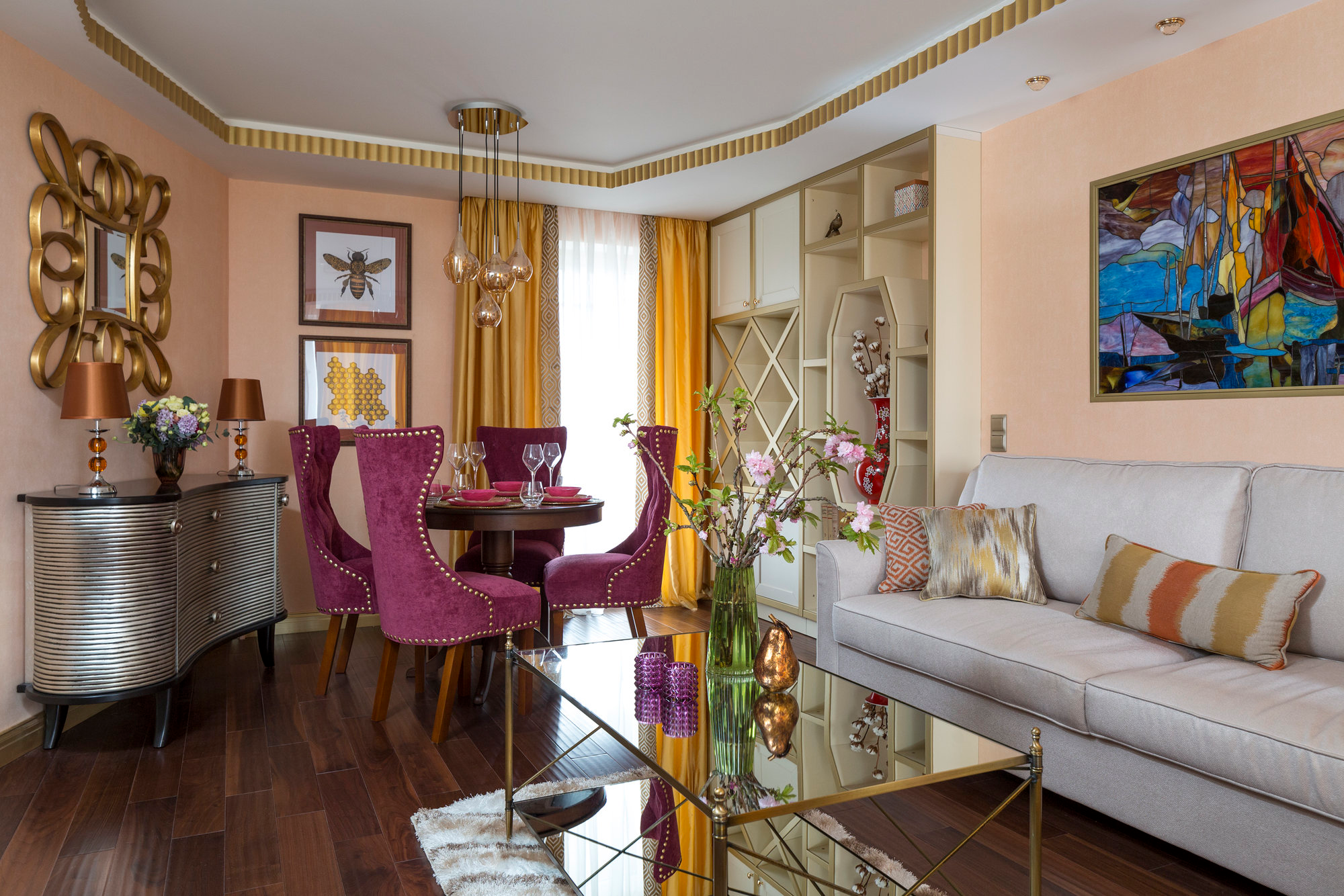 Та же самая гостиная, но уже другая зона — обеденная. Сюда я также решила добавить картины. Только в этой зоне, напротив, цветовая гамма изображений практически полностью совпадает с оттенками, в которых выдержаны текстиль и стены. В роли яркого акцента выступает обеденная группа цвета фуксии. В качестве дополнения к диптиху с изображением пчелы и сот я добавила квадратное зеркало с фигурной золотисто-медной рамой: если смотреть с ракурса, с которого сделано фото выше, можно увидеть, что композиция образует треугольник.