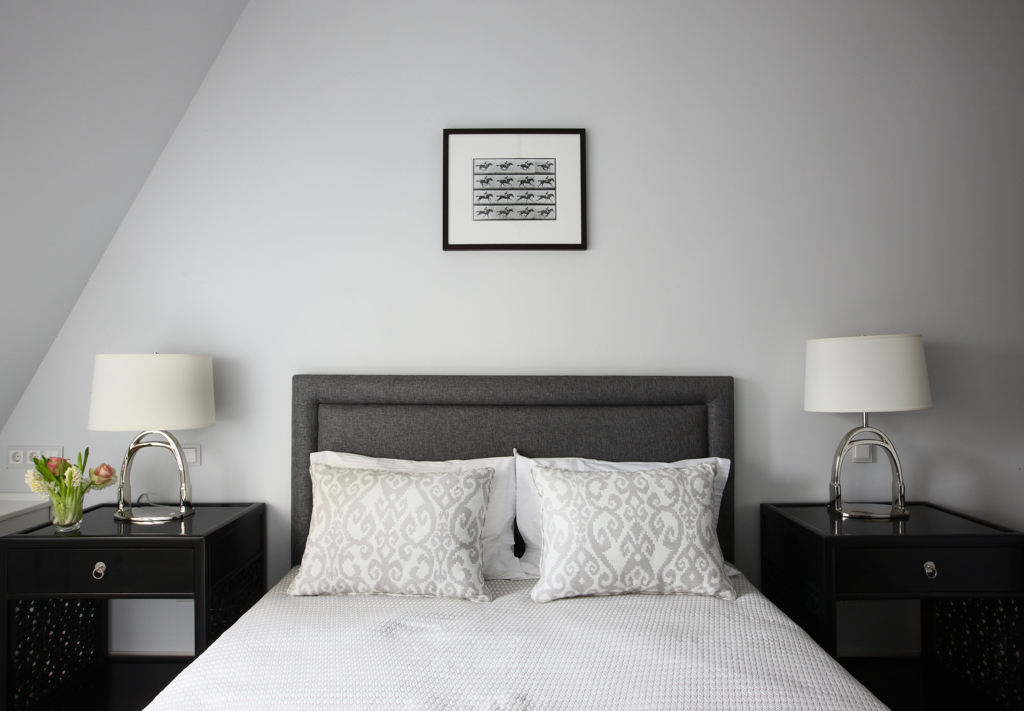 Например, для спальни в проекте «Скандинавия» эта деталь пришлась как нельзя кстати. Интерьер выполнен в монохромной, черно-бело-серой гамме. Картина, висящая над кроватью, а также рама, в которую она оформлена, сочетает в себе три основных цвета, выбранных для этой спальни. С помощью этого изображения удалось заполнить свободное пространство на стене.