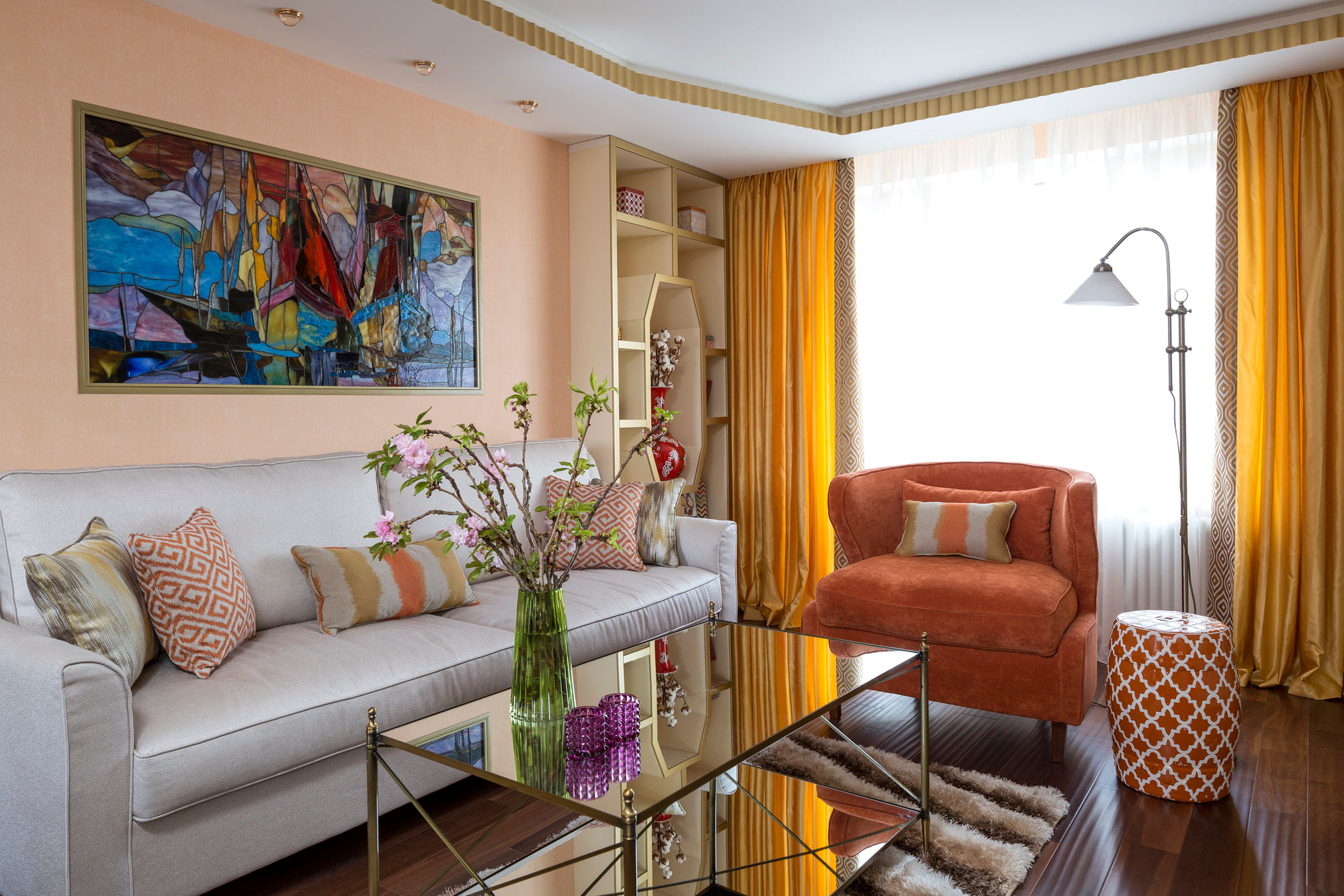 Стены окрашены в светло-персиковый цвет. Для разбавления атмосферы решено было выбрать абстрактную картину, выполненную в контрастной цветовой гамме. На изображении достаточно элементов холодных оттенков: голубого, синего и фиолетового. Также на полотне есть фрагменты красного, оранжевого и желтого цветов, поэтому оно идеально вписывается в этот яркий интерьер.