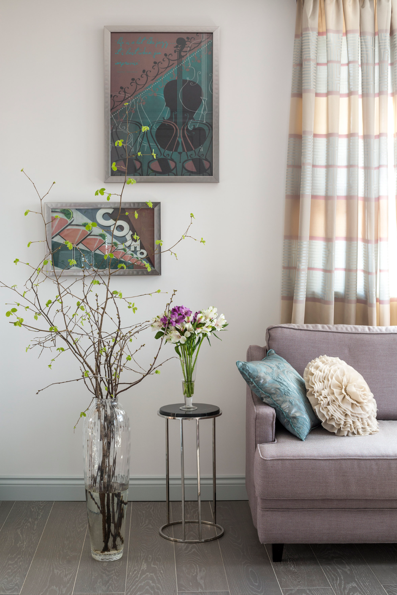 Картины способны не только подчеркнуть цветовую гамму интерьера, но и создать композицию с другими его элементами. Такой прием я использовала в проекте «ЖК GRAND DELUXE на Плющихе». Здесь над диваном расположено две ниши вытянутой формы с полками. Добавив между ними вытянутую картину меньшего размера, мне удалось заполнить пустующее пространство и создать композицию в виде трех окон. Завершает ансамбль в этом интерьере стоящее справа вытянутое тройное зеркало. В совокупности эти элементы подчеркивают устремленность ввысь.