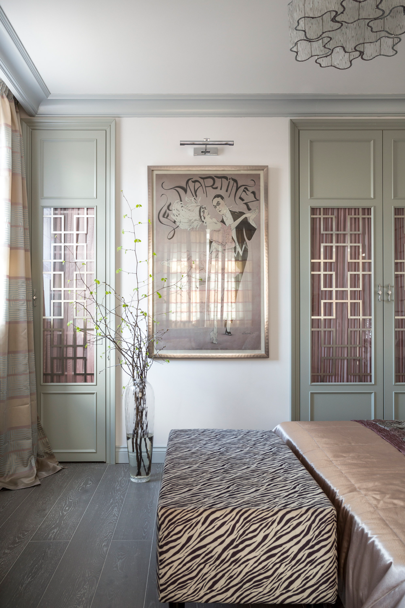 Это я учла при оформлении спальни для проекта «Танго вдвоем». В качестве основной темы я взяла музыку и танец. Первое большое полотно с изображением танцующей пары я решила расположить между встроенными шкафами. Полотно выполнено в тон с диваном и шторами пыльно-сиреневого оттенка.