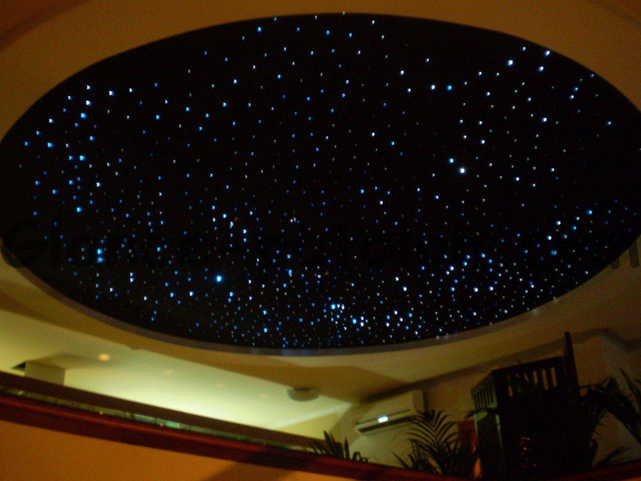 Иллюзию звёздного неба можно создать, используя светодиодные нити, располагающиеся за полотном натяжного потолка. Возникают красивые созвездия, а ритм их мерцания задается дистанционно при помощи пульта управления.