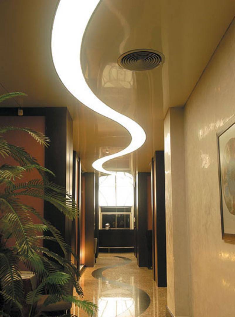 Позволяет сделать прихожую объемной, воздушной и легкой. Причудливость форм зависит от вашей фантазии. Можно создать самые разные конструкции, поражающие воображение.