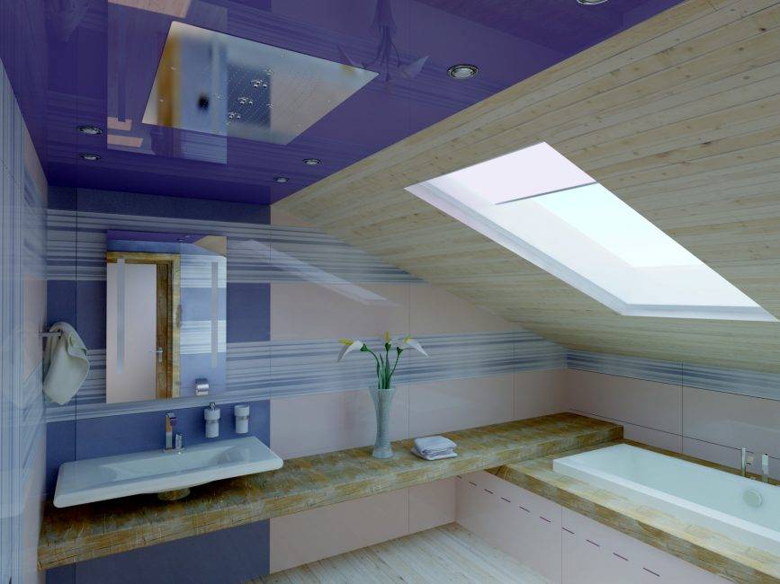 Дополнительным преимуществом является то, что глянцевое светлое покрытие зрительно расширяет пространство ванной и делает помещение выше. Такой потолок скрывает все дефекты базовой поверхности и инженерные коммуникации. Кроме этого, основание не нуждается в подготовке перед монтажом ПВХ пленки. Покрытие уменьшает высоту помещения минимум на 2-3 см при отсутствии встроенных светильников.