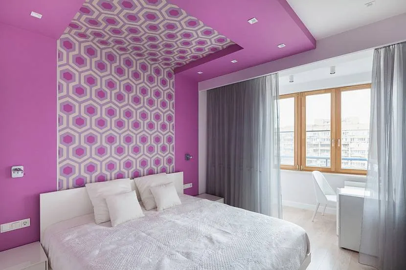 - В маленьких спальнях при оформлении потолка следует избегать контрастных сочетаний цветов и использования ярких красок. Такое оформление визуально сделает помещение еще меньше. В маленьких комнатах лучше будут смотреться белые и светлые потолки.