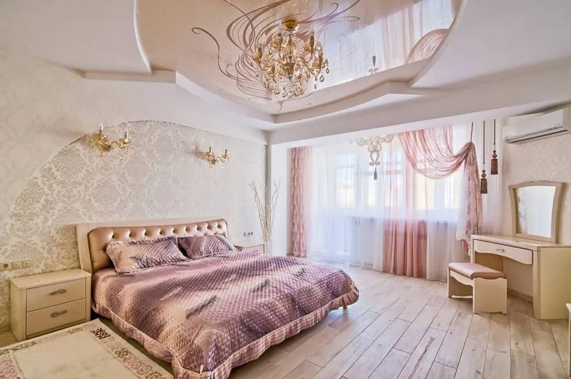 Обычно для опочивальни выбирают одноуровневый потолок, но в большом помещении можно создать и не совсем обычный дизайн, используя возможности многоуровневых конструкций.