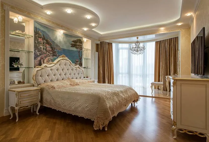 Уход за потолком с элементами декора в спальне