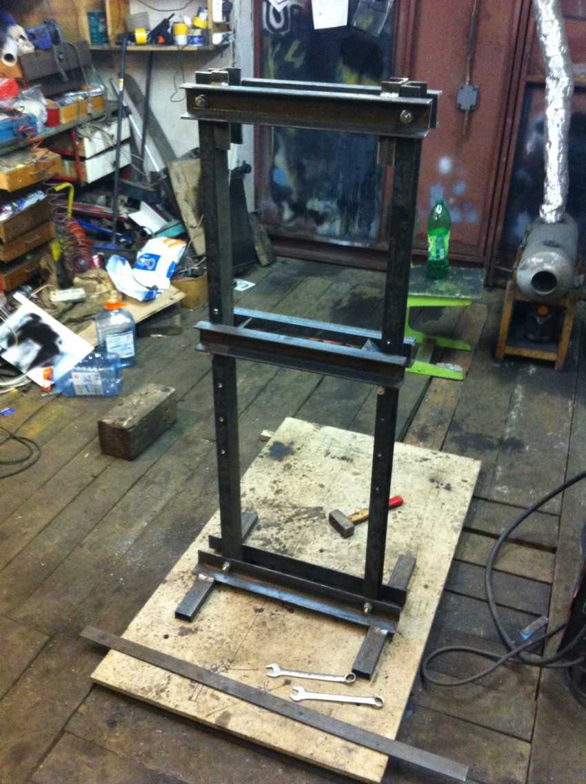 Базой будет опорная платформа, способная выдерживать необходимую нагрузку. Основание нужно сделать как можно более прочным, так как давление прилагается пропорционально рабочим узлам. Рассчитывайте необходимую прочность так, чтобы станина была способна выдержать приходящуюся на нее нагрузку с запасом, так как работающий пресс самодельный будет стремиться разорвать рамную конструкцию.