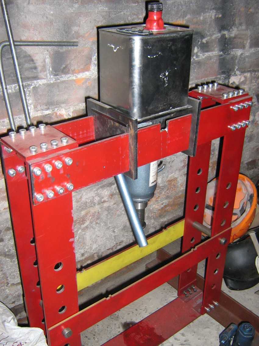 - Домкрат закрепляется в верхней части конструкции пресса и давит, соответственно, вниз.