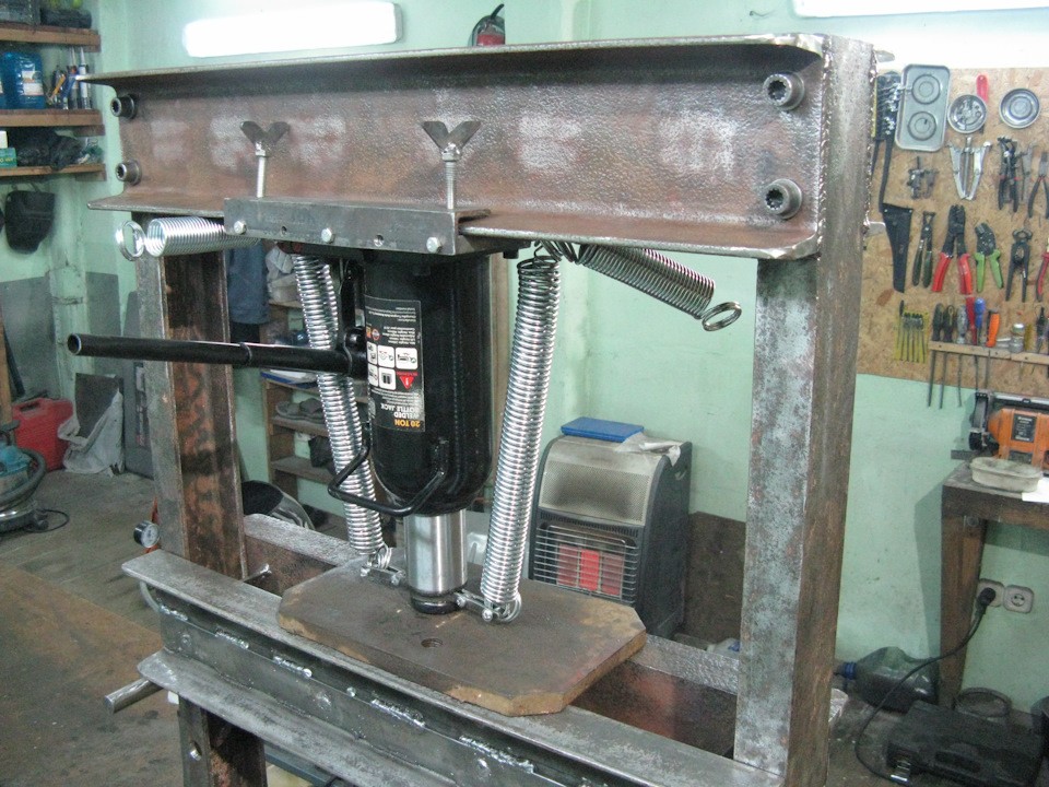 Кроме того, вам потребуются следующие элементы, из которых будет состоять ваш будущий пресс для гаража: гидравлический домкрат, две пружины, которые будут оттягивать подвижную платформу в исходное состояние. Если вы найдете в своем гараже старый грибок моста, оставшийся после ремонта, то его можно использовать в качестве элемента оттягивающего приспособления для самодельных прессов с нижним расположением домкрата. В таком случае грибок надевают на шток домкрата, верхнюю часть пружин крепят непосредственно к нему, а нижнюю закрепляют на станине.
