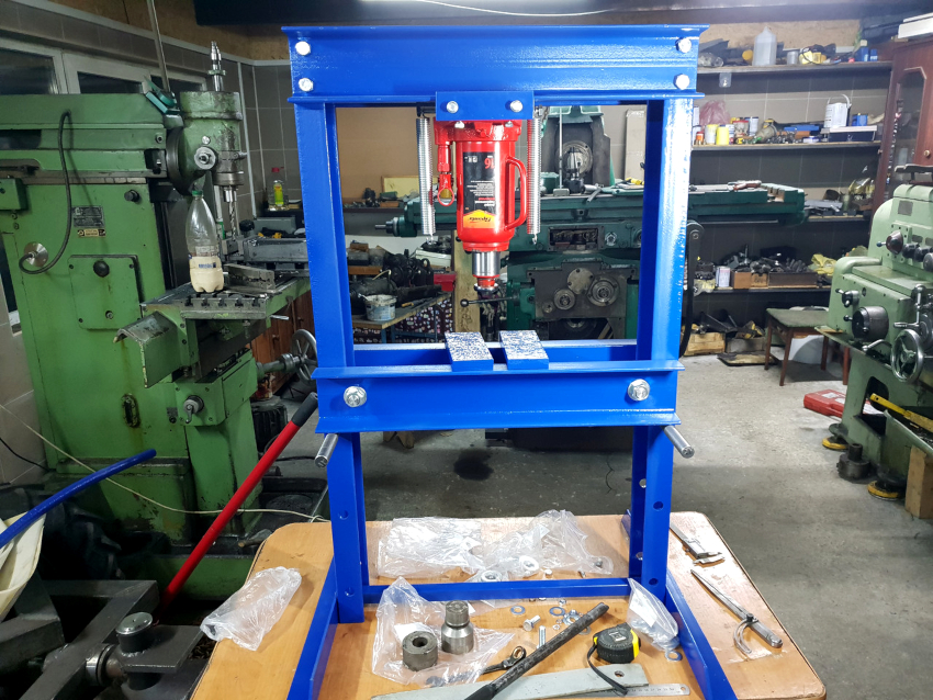 Некоторые мастера предусматривают установку винтовых опор, позволяющих монтировать оборудование на неровном полу. На нижней поперечине могут располагаться тиски или оправка для удержания обрабатываемых деталей. Силовое воздействие осуществляется стальной пластиной или пуансоном, изготовленным из болта либо прутка (приспособление позволяет выдавить подшипник качения из шестерни или корпусной детали).