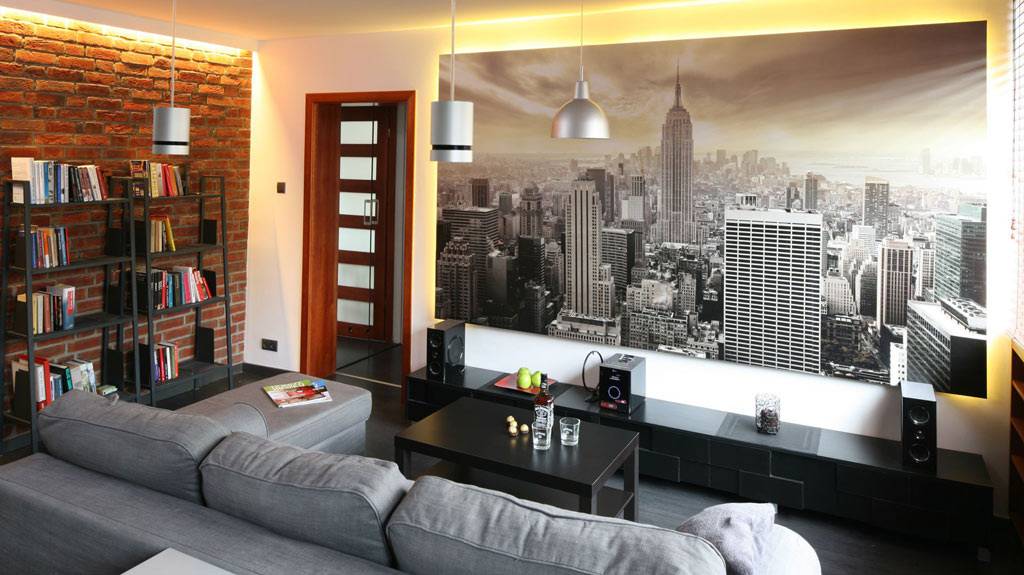 Изображения на обоях создают идеальное оформление для зоны отдыха, которое достаточно дополнить диваном и парой кресел. Если мебель яркая, обои должны быть приглушенными, выполненными в черно-белой гамме, так как привлекающий взгляд акцент в помещении уже есть.