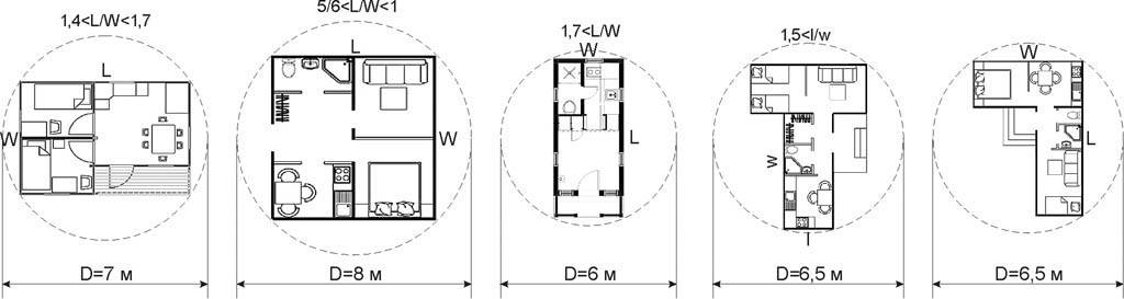 Не вдаваясь в дальнейшие подробности, сразу сообщим вывод: если небольшой деревянный дачный домик в плане вписывается в круг определенного диаметра, то на обычных грунтах садовых участков его можно строить на незаглубленном фундаменте, что много скорее, проще и дешевле. В какой круг должен вписываться проект деревянного домика в плане, чтобы можно было строиться на незаглубленном фундаменте на грунтах до среднепучинистых включительно, показано на рис. Тут все зависит, как видим, от пропорций строения: чем дом «квадратнее», тем лучше он отыгрывает сезонные подвижки грунта. Поэтому дома-«трамвайчики» для узких участков лучше, не приглядываясь, строить на фундаменте нормального заглубления. А вот если отношение «палочки» Т-образного дома лежит в пределах 1<l/w<1,5, то его можно вписывать в круг диаметром 7 м, как дом классических пропорций. Дома-углы вписываются в круг D=6,5 независимо от пропорций сторон угла.