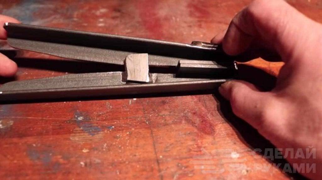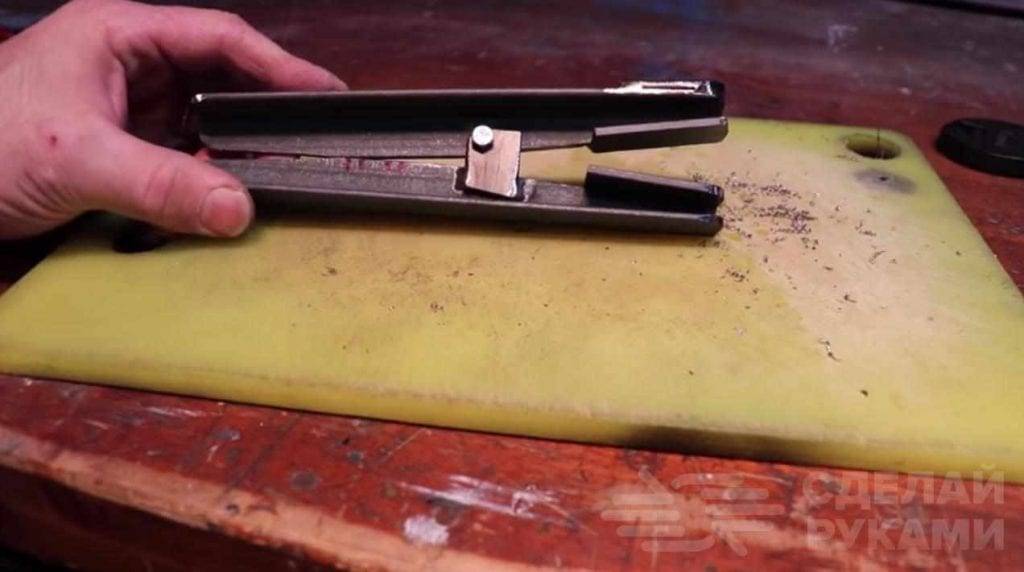 Также для изготовления этой самоделки потребуется четыре куска стальной полосы шириной 20 мм, толщиной — 3 мм. Длина заготовок: две по 50 мм, 40 и 25 мм. После этого к одному уголку необходимо приварить отрезки полосы металла длиной 50 и 40 мм, а ко второму— 50 и 25 мм.