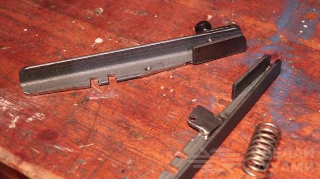 После этого необходимо еще сделать две квадратные прорези болгаркой, а также просверлить отверстие на краю уголка под болт, который будет фиксировать прижимную пластину. Затем останется только собрать все детали в кучу, включая саму пружину, и покрасить готовое изделие.