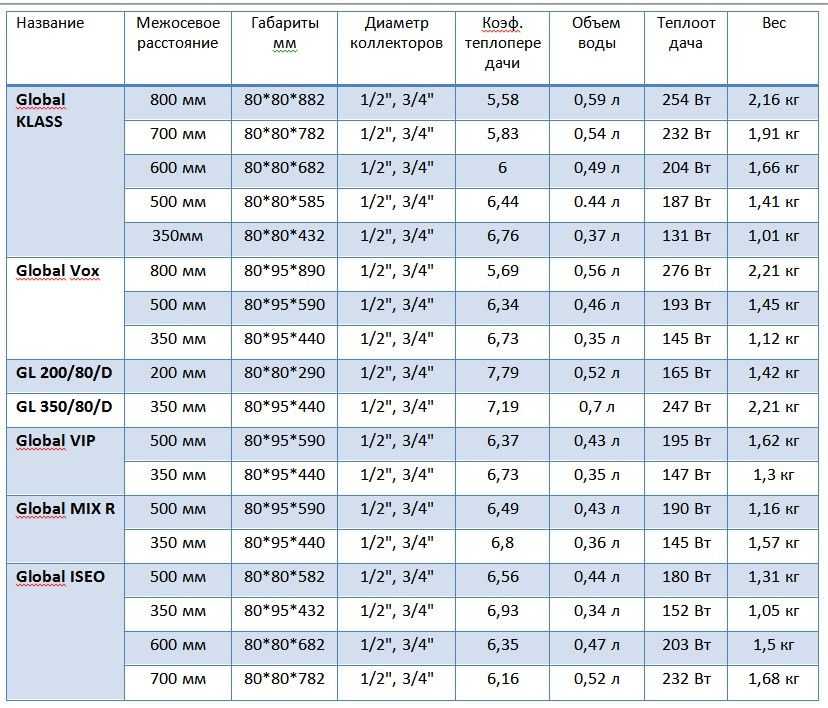 Таблица технических характеристик алюминиевых радиаторов Global (кликните чтобы увеличить размер картинки)