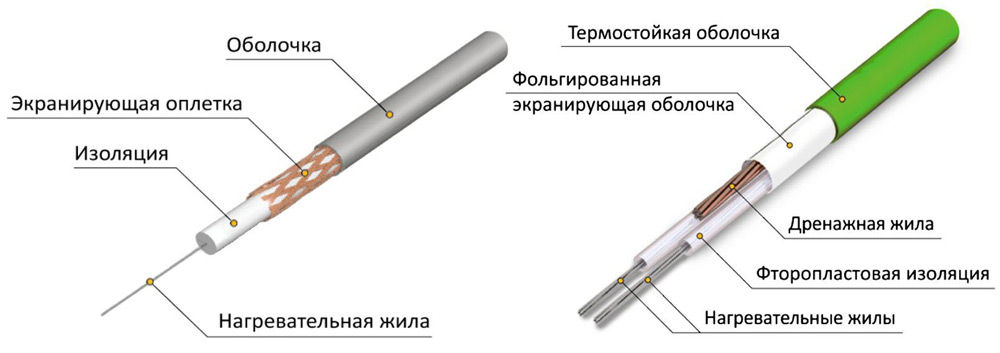Двужильный стоит немного дороже, но и трудностей с ним меньше. Расположение проводов для подачи и возврата тока в одном кабеле решает обе озвученные проблемы. При его монтаже достаточно учесть геометрию помещения, а индукционное поле гасится движением тока в разных направлениях.