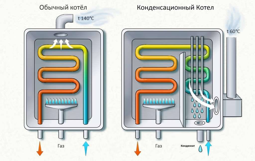 Работа этого прибора строится на дополнительном отборе тепла, образующегося при конденсации водяного пара – оного из продуктов сгорания газа. «Довесок» получается весьма значительный!