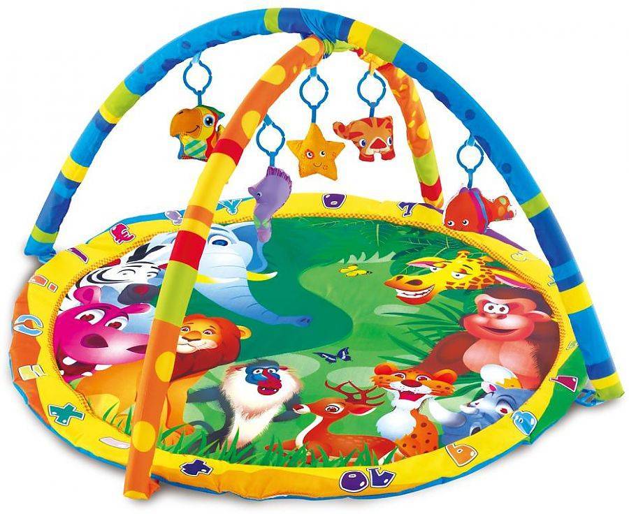 По бокам изделия закреплены прочные безопасные дуги с подвесными элементами. Игра на коврике способствует развитию мелкой моторики, зрения и координации движений. Специалисты рекомендуют пользоваться изделием с полугодовалого возраста. В производстве использованы только экологически безопасные материалы. Коврик круглый, с диаметром 830 мм. В комплект входят: погремушка, 5 подвесных игрушек, сумка для хранения и переноски изделия в сложенном виде.