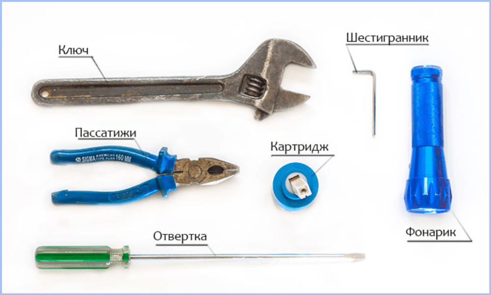 Когда причина поломки установлена, можно начинать ремонт кухонного смесителя. Но, прежде чем приступить, потребуются закрыть подачу воды на устройство и следующие инструменты: разводной ключ, отвертка, шестигранник, фонарик и заменяемая деталь.