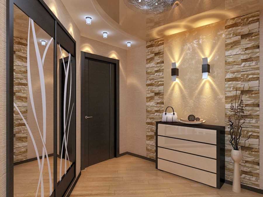 Чем светлее обои и пол в прихожей, тем меньше нужно применять точечных светильников. Достаточно будет повесить небольшую люстру и подсветить зоны у шкафа, зеркала, обувницы.