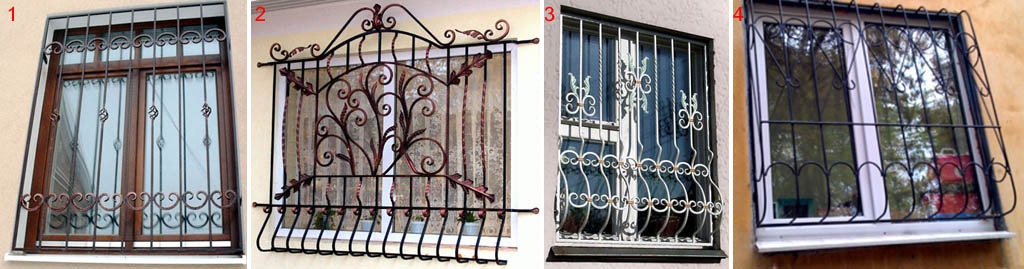 Оптимальны во всех отношениях оконные решетки плоские, поз. 1 на рис. Но иногда приходится делать решетки с волной (карманом, «пузом»): чтобы обойти отлив пластикового окна в проеме с узкими откосами, поз. 2, или если наклоняемая створка окна выходит наружу, поз. 3. Такого же типа решетки, но с «пузом» побольше и с плоской его нижней частью, делают под цветочные горшки. Нередко ставят на окна и дутые решетки, полностью выступающие из стены, поз. 4. Если окно в глубокой нише, а его створки узкие, то их можно будет распахивать наружу.