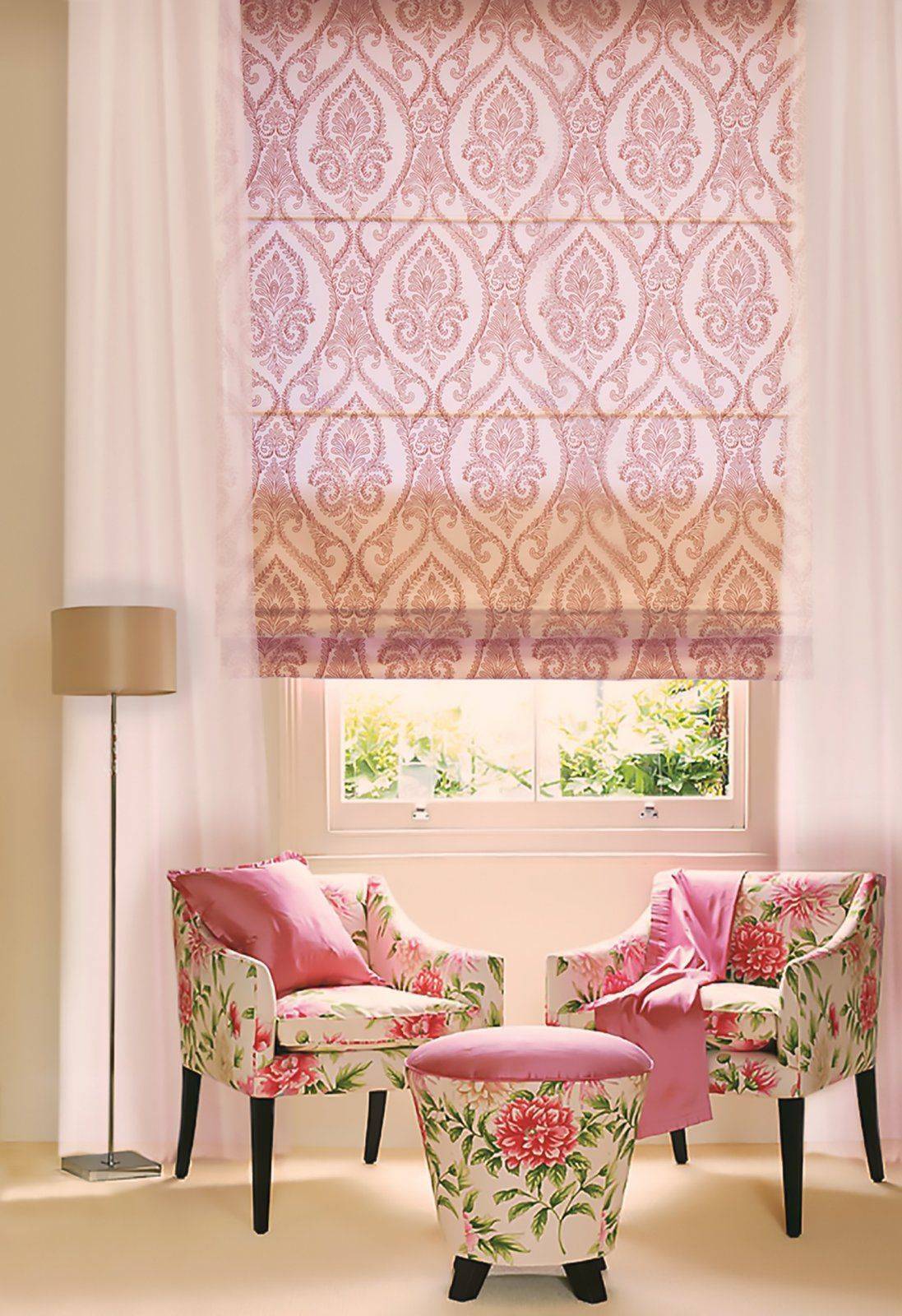 Нежные розовые римские шторы с рисунком в гостиной комнате
