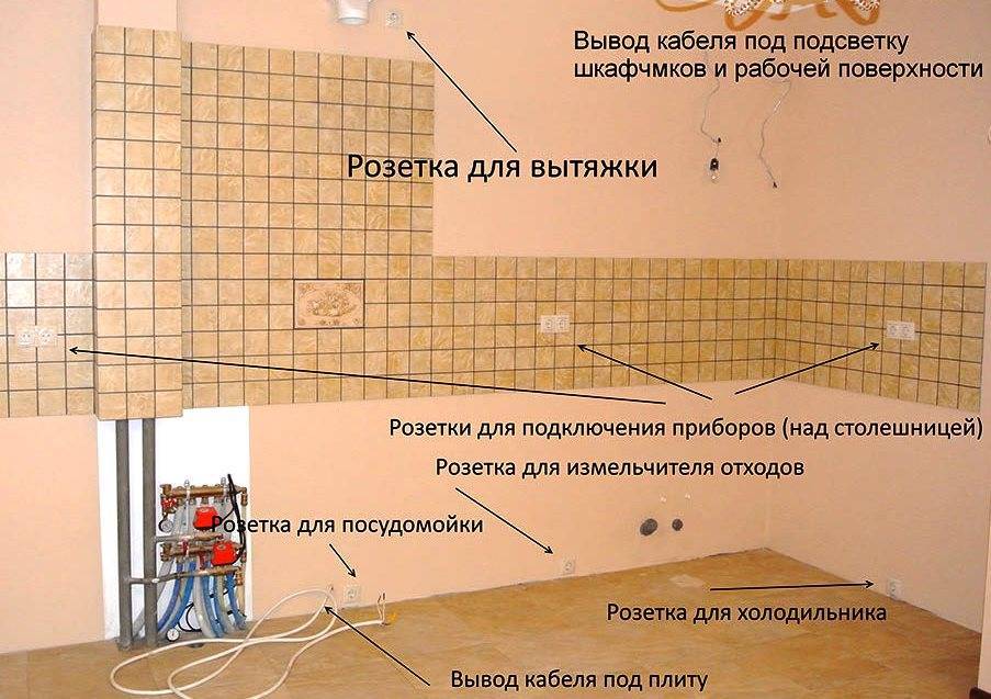 Установка розетки над холодильником, духовкой, вытяжкой или другими электрическими приборами запрещена. Они должны находиться сбоку, расстояние не менее 20 см.
