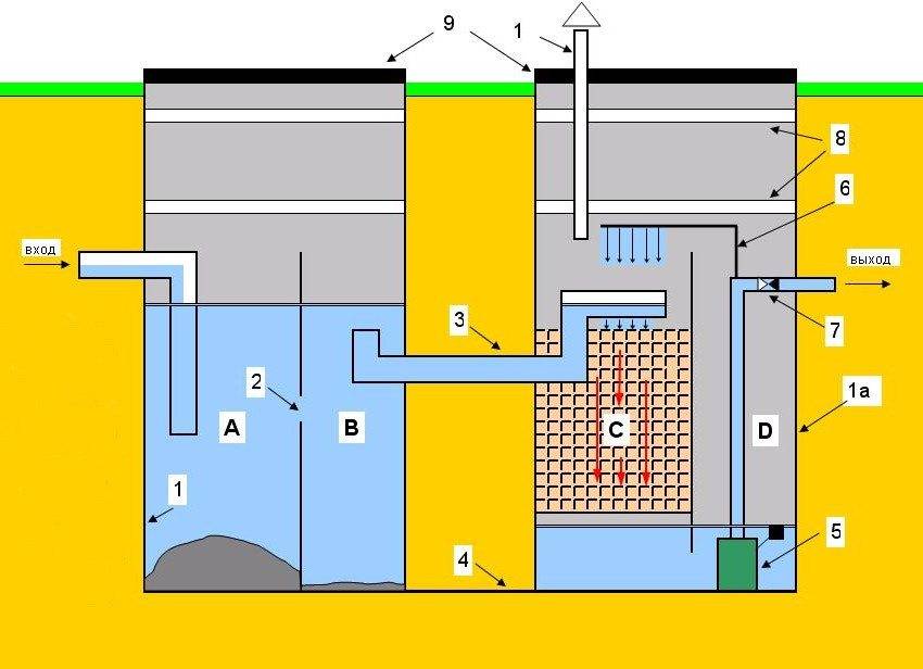 Схема устройства септика из бетона: А — септическая зона; В — зона анаэробного сбраживания; С — биофильтр; D — приемник-накопитель очищенных стоков; 1, 1а — металлический корпус; 2 — перепускные отверстия; 3 — перепуск между секциями; 4 — основание против всплытия; 5 — насос; 6 — труба вторичной очистки; 7 — обратный клапан; 8 — пенопласт; 9 — крышка; 10 — труба для удаления биогаза