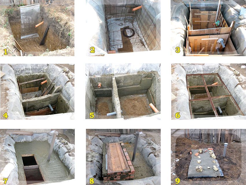 Порядок изготовления септика своими руками: 1 — подготовка котлована и подвод труб; 2 — армирование; 3 — устройство опалубки; 4 — бетонирование; 5 — снятие опалубки; 6 — установка металлических уголков; 7 — укладка плоского шифера, оформление люков, цементирование, монтаж вентиляционной трубы; 8 — обустройство ревизионной шахты; 9 — гидроизоляция, утепление, засыпание землей