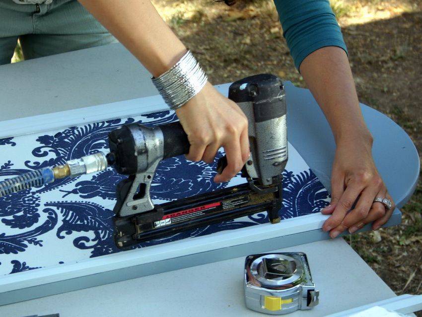Каждый лист покрывают тонким слоем клея ПВА и приклеивают к полотнам. При выполнении этой процедуры нужно следить, чтобы клей не вытекал на ткань. После этого дают клею полностью высохнуть. Подготовленной тканью заполняют секции ширмы. С помощью степлера к одной из сторон рамы крепят полотно, а затем, натягивая ткань, фиксируют ее к остальным элементам рамы. Рекомендуемое расстояние между скобами составляет 4-5 см.