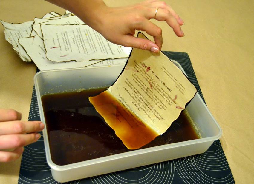 Далее, приступают к раскрою ткани. Из нее вырезают 3 части соответствующего размера. До того как ткань будет прикреплена к рамам, ее декорируют. На подготовленные бумажные страницы кистью наносят чайный раствор. Перед нанесением, заварку следует тщательно процедить через мелкое ситечко. Чтобы бумага после высыхания не сморщилась, каждый обработанный лист следует прогладить утюгом. Когда все листы будут высушены, их приклеивают к ткани.