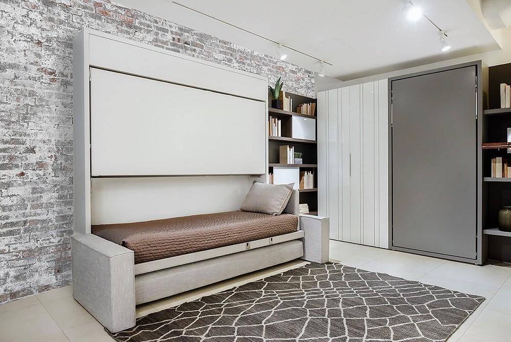 В интерьере спальни с гостиной площадью менее 15 кв. м будет уместна мебель-трансформер. Эти изделия экономят пространство, так как занимают меньше места.
