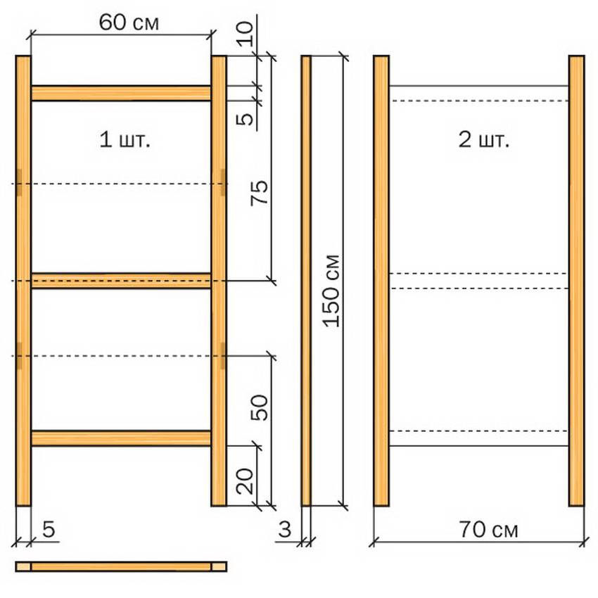 Работу начинают со сборки рам каркаса. Бруски необходимо подогнать по размерам створки и соединить в рамы. При скреплении брусков следует пользоваться угольником, чтобы соблюсти прямой угол и не допустить перекоса створок. Между собой элементы рамы соединяют посредством саморезов или гвоздей. Готовые конструкции покрывают лаком и оставляют до полного высыхания покрытия.