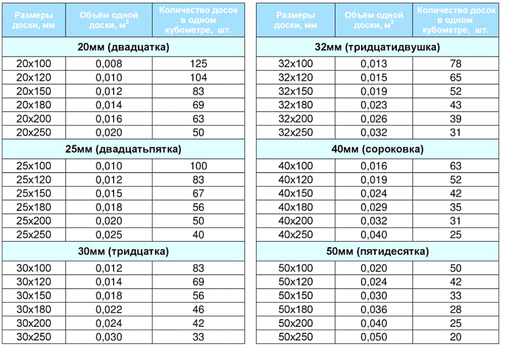 | Размер доски | Объем 1-й доски (м3) | Количество досок в 1м3 (шт.) | Количество метров квадратных в 1м2 |