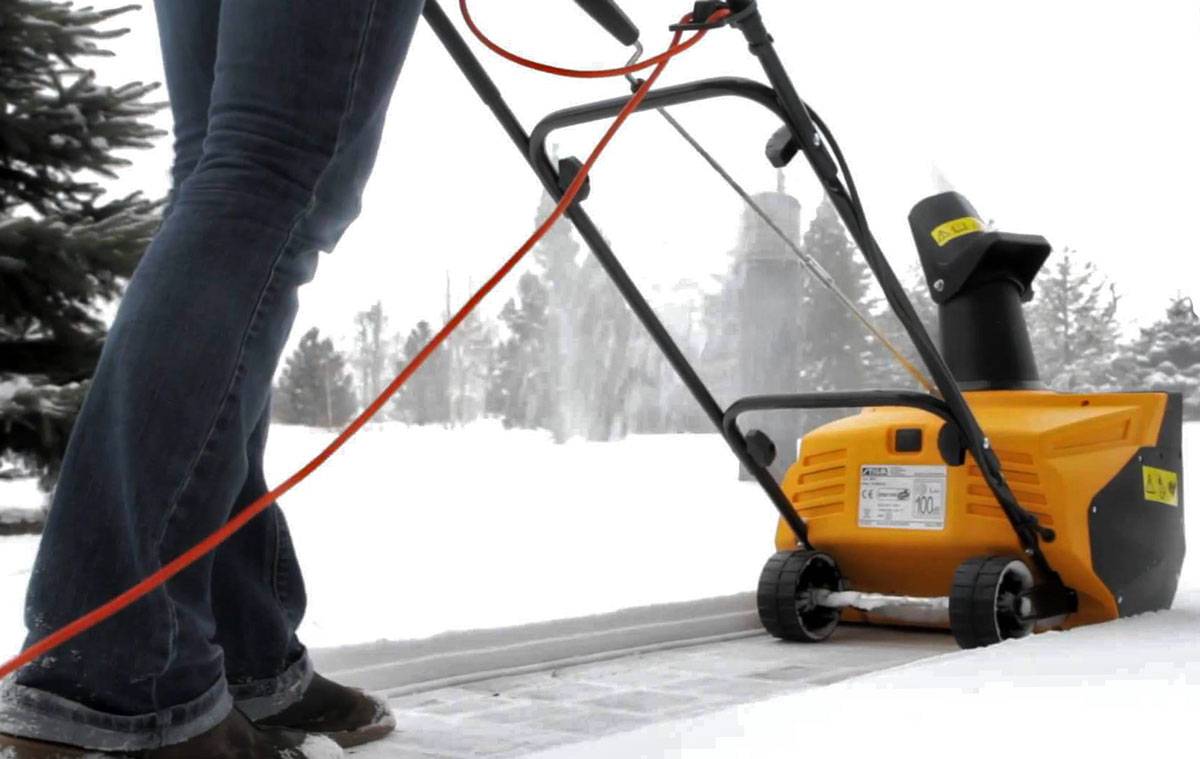 Если техника нужна только для периодической очистки небольшого, мощёного плиткой или асфальтом, пятачка у гаража или у крыльца, подойдёт и недорогая снегоуборочная электрическая лопата. Параметры её весьма скромные: ширина захвата 28-35 см, мощность около 1000-1200 Вт. Однако такой машинкой можно отбрасывать снег достаточно далеко, на 5-7 м. Но учтите, что работать ею придётся, как обычной лопатой – внаклонку, придерживая за ручку, потому что выпускного жёлоба у электролопаты нет, а между тем вес таких лопат начинается от 5.5 кг. И самое главное – для уборки слежавшегося снега и для покрытых щебнем дорожек она не подойдёт, пластиковый шнек будет трескаться.